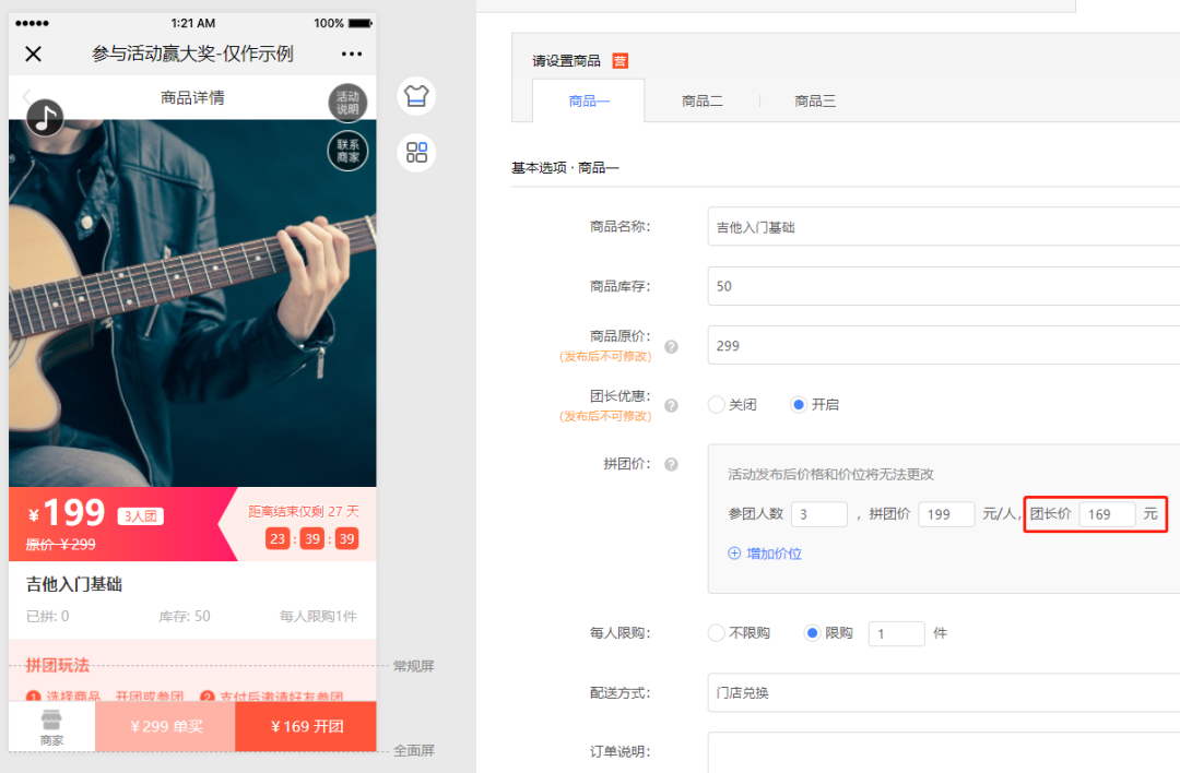 同时给予老用户(团长)一定的价格优惠,刺激更多老用户参与活动,提升裂变和转化效果。